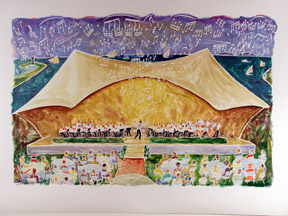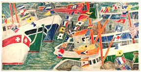 "Dancing Draggers - Blessing of the Fleet" (36" x 72") is Bill Evaul's newest large woodblock print iis the centerpiece of an exhibition of paintings and drawings spanning 36 years of the Provincetown fishing fleet. |
