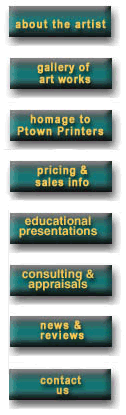 A Provincetown artist since 1970, William Evaul produces oil paintings and white-line woodblock prints as well as works on paper: drawings, watercolors and monotypes and monoprints. He employs a vibrant color palette and a kind of figurative expressionism to create a wide variety of images including musicians, New York skylines, nudes, wine bottle still lifes and a lively fauvist/cubist series called "Dancing Houses." As an educator, curator and art consultant in the field of 20th Century Art, Evaul conducts art workshops in white-line wood cut printmaking, slide lectures on Provincetown Art History, organizes exhibitions, produces certified appraisals and can advise on collection management. Browse this site for a sampling of the artwork and contact us directly for more information. Enjoy! |